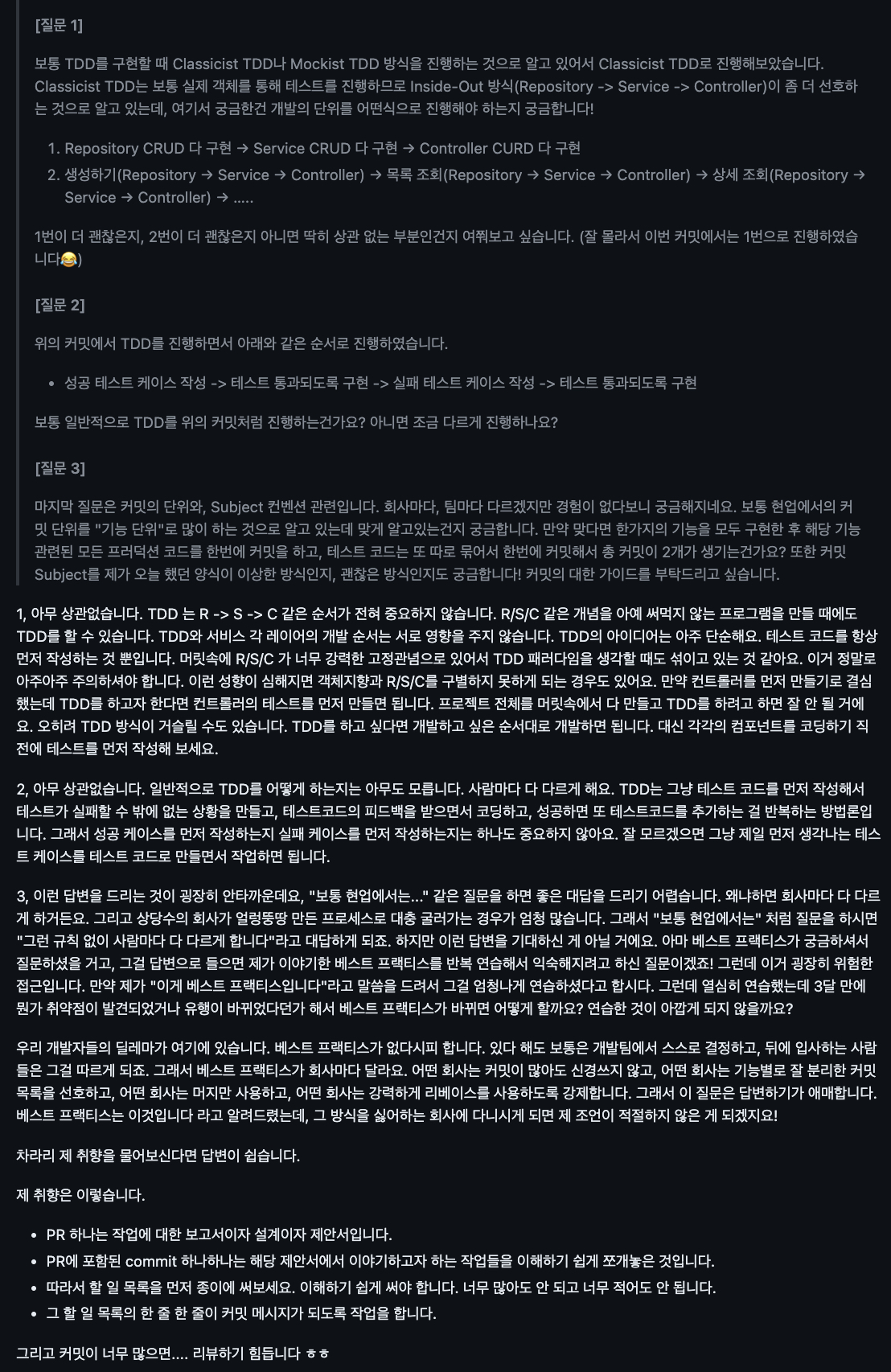 - 테스트 코드를 먼저 짜든, 나중에 짜든 우리한테 중요한 건 퍼포먼스가 너무 떨어지지 않도록 비즈니스 요구 사항을 개발해 나가고 배포 나가기 전에만 핵심 로직들을 여러 검증 요소들을 통해 테스트 코드로 커버해 나간다면 이미 충분하다고 생각한다.