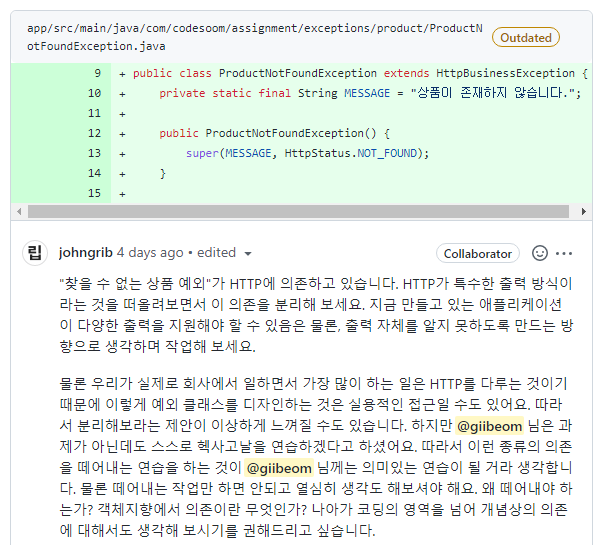대부분의 현업에서는 HTTP 통신을 위주로 하기 때문에 Exception 객체에서 HTTP를 관리하는 것이 실용적일 수는 있지만, 객체 지향적인 관점에서는 관심사를 분리해 주는 것이 바람직해 보였다.