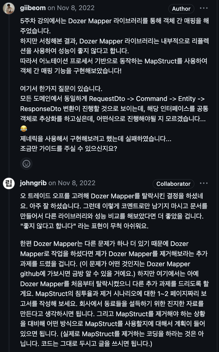 물론 크리티컬한 성능 저하가 아닌 마이너한 수준이긴 하지만, 사용성 또한 MapStruct와 ModelMapper 둘 다 편하고 레퍼런스도 많기 때문에 MapStruct를 사용하기로 결정을 하고, 종립 멘토님께 선 코멘트를 남겼더니 아래와 같은 답변을 해주셨다.