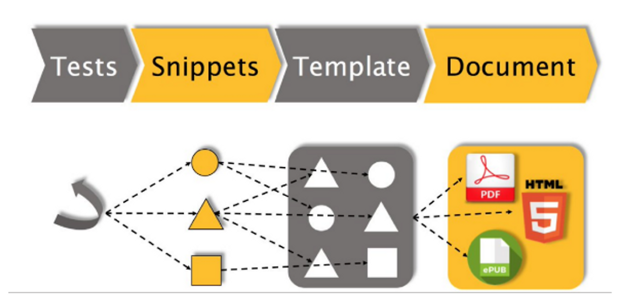 Test 실행 → 문서 조각(Snippets) 발생 → 템플릿에 맞게 스니펫들이 끼워 맞춰 짐 → 문서로 전환