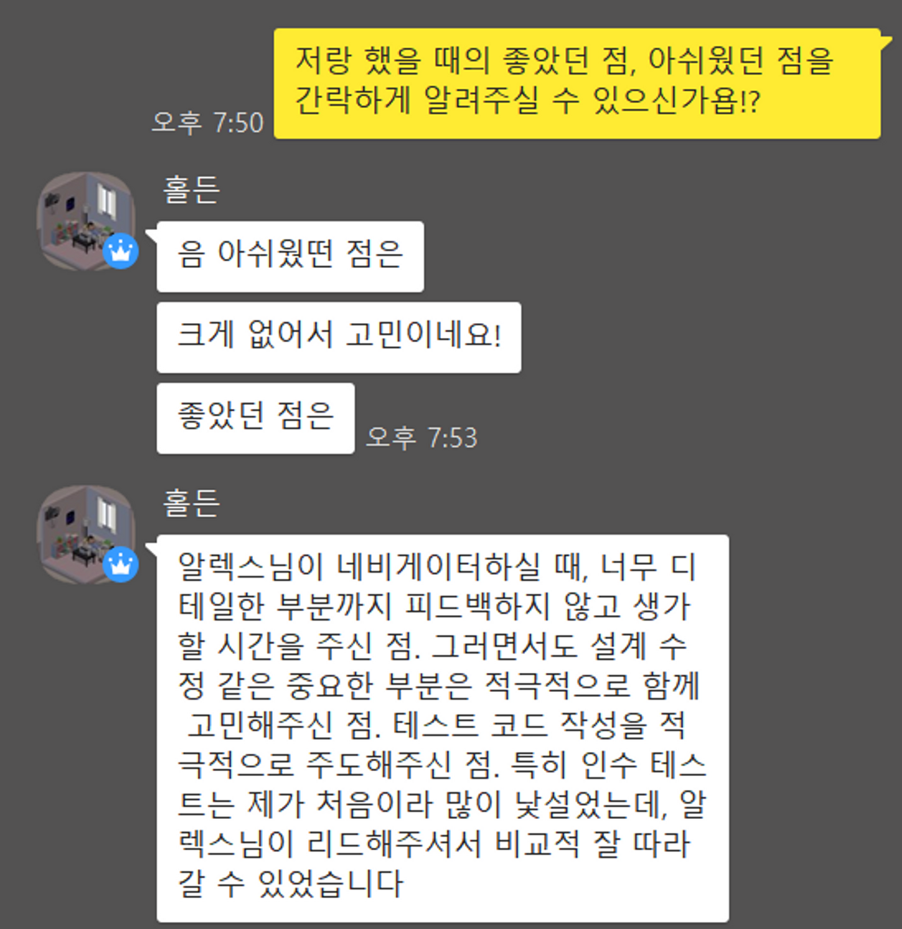 미션이 끝나고 홀든님에게 페어 프로그래밍 피드백을 요청했다. 아쉬웠던 점이 있었다면 고쳐봐야겠다는 생각이었는데, 감사하게도 아래 사진처럼 칭찬만 해주셨다.