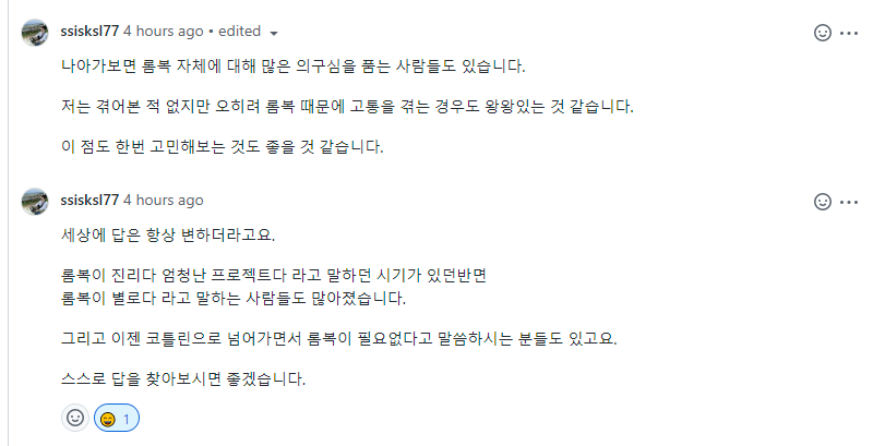 - ex) Lombok이 마냥 편하고 진리인 라이브러리로 환영받던 예전과 달리 지금은 Lombok이 별로다, 위험하다는 개발자들이 많아지고, 더 나아가서는 코틀린에서는 필요가 없다고도 한다.